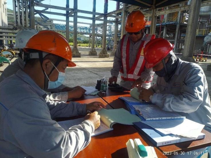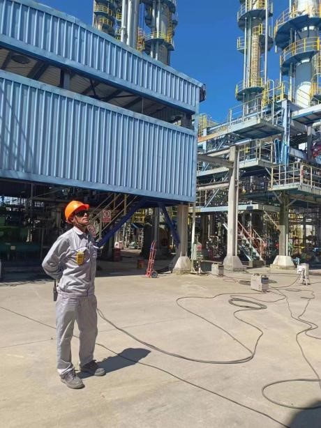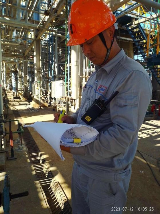 技術(shù)改造項(xiàng)目負(fù)責(zé)人——正己烷車間副主任劉存、大檢修工作檢修協(xié)調(diào)組組長(zhǎng)陳高輝在現(xiàn)場(chǎng)檢查工作。