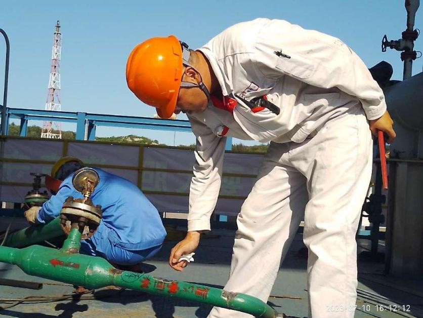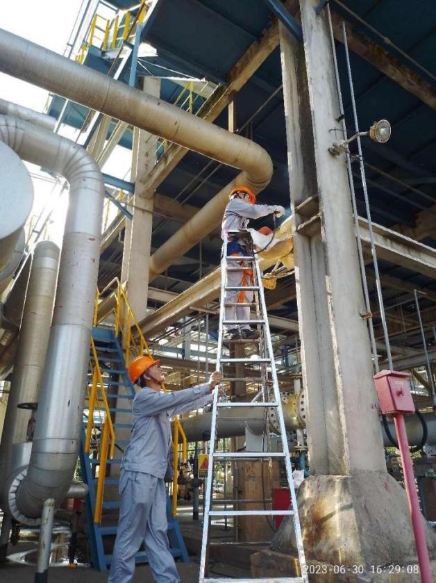張曉東在塔頂對(duì)安全閥除銹、打磨作業(yè)進(jìn)行監(jiān)護(hù),正己烷車間主任黃維山對(duì)管線補(bǔ)焊情況進(jìn)行檢查。