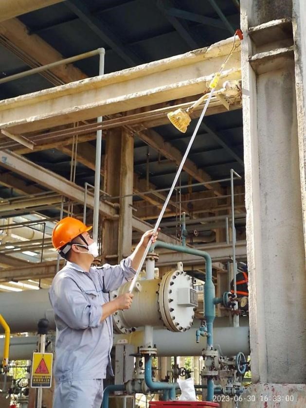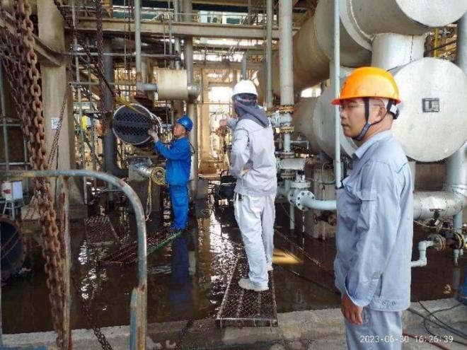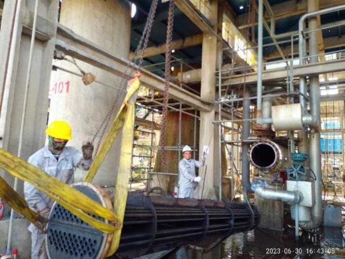 設(shè)備工程部專工武良對(duì)換熱器E-205抽芯作業(yè)進(jìn)行檢查指導(dǎo)。
