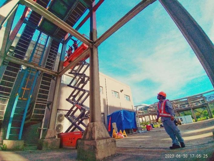 電工班師傅在裝置區(qū)進(jìn)行照明燈掛件焊接及防腐刷漆作業(yè)。