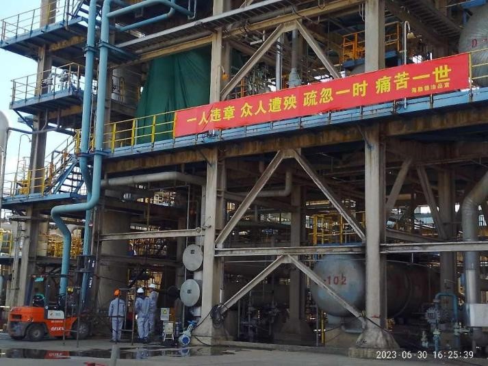 海順德(漳州)特種油品公司2023年裝置大檢修工作6月28日開始,于7月21日結(jié)束,大檢修工作實(shí)現(xiàn)了安全、按期、優(yōu)質(zhì)的目標(biāo)。大檢修期間共完成外委檢修項(xiàng)目50項(xiàng)、自檢項(xiàng)目42項(xiàng)。其中完成技術(shù)改造項(xiàng)目4項(xiàng),消除管道銹蝕點(diǎn)108處,消除了空冷器風(fēng)筒底板及筋板嚴(yán)重銹蝕等設(shè)備隱患9處,完善了裝置界區(qū)閥門操作平臺(tái),更換了腐蝕嚴(yán)重的氫氣壓縮機(jī)頂棚,對(duì)火炬頂部存在的隱患進(jìn)行了徹底整改,完成了對(duì)裝置壓力管道的定檢及缺陷修復(fù)等工作。