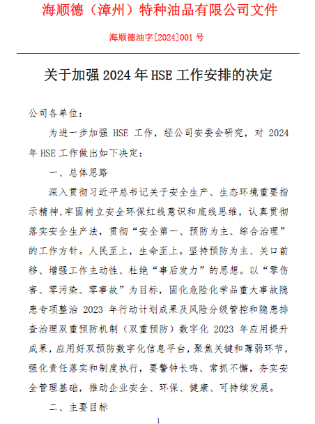 為認(rèn)真落實(shí)習(xí)近平總書記關(guān)于做好安全工作的指示、批示精神,筑牢安全防線。公司安全生產(chǎn)委員會于2023年12月20日組織召開了做好2024年HSE工作的討論會,旨在對公司2024年的HSE工作進(jìn)行頂層設(shè)計,避免安全工作的隨機(jī)化和碎片化管理。對討論會上提出的意見或建議進(jìn)行完善或修改后,2024年元月2日下發(fā)了海順德(漳州)特種油品公司《關(guān)于加強(qiáng)2024年HSE工作安排的決定》。決定明確了公司全年的HSE目標(biāo)及落實(shí)企業(yè)安全生產(chǎn)主體責(zé)任、強(qiáng)化直接作業(yè)環(huán)節(jié)安全管理、事故責(zé)任追究等15項主要工作。
